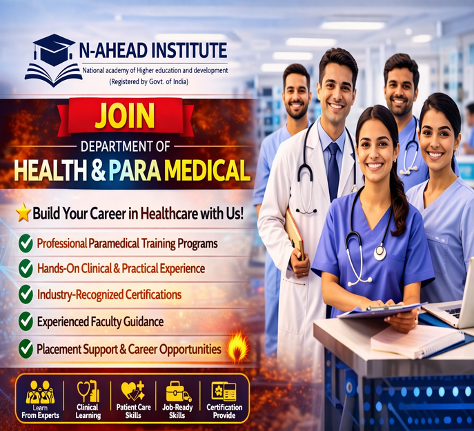 The Department of Paramedical and Health Care at N-AHEAD is dedicated to providing quality education and practical training in allied health sciences. The department aims to develop skilled healthcare professionals who assist medical practitioners in patient care, diagnosis, and clinical services. Emphasis is placed on hands-on training, professional ethics, and safety standards to meet the growing demand of the healthcare sector.